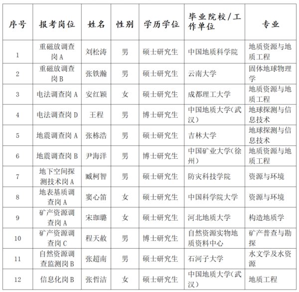 根据《中国地质调查局局属单位2026年度公开招聘工作人员公告(第一批)》,经个人报名、资格审查、笔试、面试等程序,按照考生综合成绩由高到低的排序确定了考察对象,现将名单公告如下: