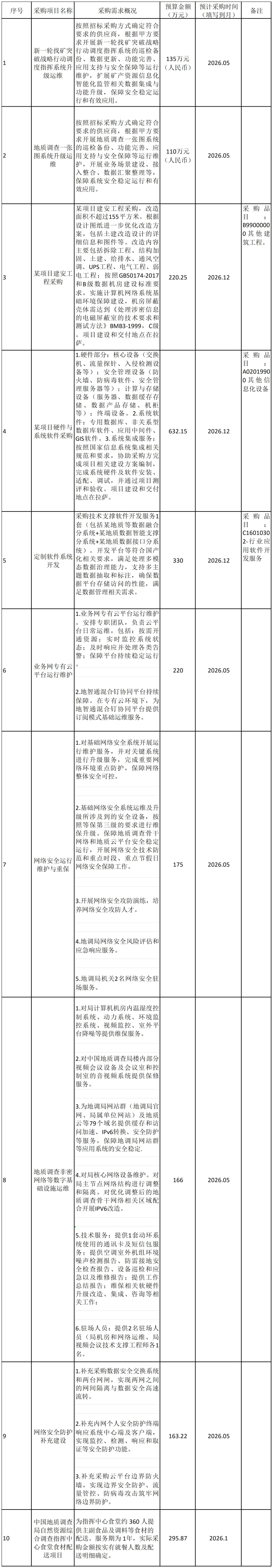 为便于供应商及时了解政府采购信息,根据《财政部关于开展政府采购意向公开工作的通知》(财库〔2020〕10号)等有关规定,现将中国地质调查局自然资源综合调查指挥中心2026年5月(至)12月采购意向公开如下: