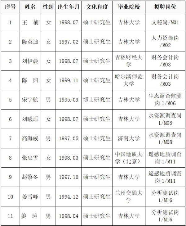 (注:自然资源调查监测岗/M05无人参加面试、信息化岗/M18参加面试人员面试成绩低于60分。故此次招聘取消。)